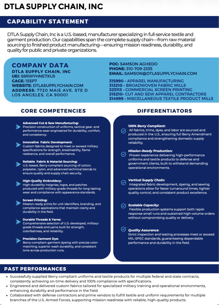 At DTLA Supply Chain, Inc., we proudly support government agencies, defense contractors, and prime vendors with high-quality uniforms, tactical gear, and textile products. Our vertically integrated production system allows us to control every detail — ensuring faster turnaround, consistent excellence, and full compliance with federal manufacturing requirements.